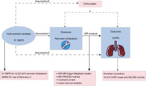 The principle underlying these phenomena is that the level of RC in the human body is positively correlated with the expression level of inflammatory biomarkers. COPD is an airway disease related to systemic inflammation (12), and previous studies have mainly focused on the association between LDL-C or high-density lipoprotein cholesterol (HDL-C) and COPD. We aimed to explore the association between RC levels and the pathogenesis of COPD and to consider whether RC levels can be used to judge the severity of COPD. To address this issue, it is essential to identify the underlying association between RC levels and their major determinants. Genetic factors are the dominant contributors to lipid levels; for instance, up to 40% of the interindividual variations in lipid levels can be explained by genetic factors (18). MR is an analytical method that uses genetic variation as an instrumental variable to investigate potential causal relationships between modifiable exposure factors and outcomes (19,20). Here, we used MR to minimize bias due to confounding and reverse causation (21).