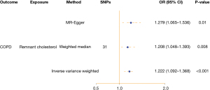 CI, confidence interval; cML-MA, constrained Maximum Likelihood and Model Averaging; COPD, chronic obstructive pulmonary disease; IVW, inverse variance weighted; MR, Mendelian randomization; OR, odds ratio; PRESSO, Pleiotropy RESidual Sum and Outlier; RadialMR, Radial Mendelian Randomization.