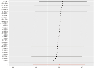 Genome-wide significant SNPs were extracted from cohorts of individuals with RC and COPD, there are 12,321,875 SNPs associated with RC in the GWAS database, but there are three core assumptions that must be met for an effective MR analysis: (I) correlation setting: with only the SNPs with P values <5×10−8 being considered significant variants associated with the corresponding phenotype (included for further analysis). When meeting the first major assumption of MR and harmonization, 41 SNPs are first screened out. The specific information is in https://cdn.amegroups.cn/static/public/jtd-24-1894-1.xlsx. (II) Independent setting: thresholds of r2=0.001 and 10,000 kb were used to exclude SNPs via linkage disequilibrium analysis. The above criterion facilitated the deletion of SNPs possessing an r2 value exceeding 0.001 within the 10,000 kb range of the most noteworthy SNP (24). (III) Statistical strength setting: to counteract potential instrumental variable bias, we computed the F-statistics for each SNP and excluded those scoring below 10 (25). An F-statistic below 10 indicates a weak instrumental variable, implying probable bias in the outputs (26). We used LDlink (https://ldlink.nci.nih.gov/?tab=ldtrait) to identify SNPs associated with confounding (P<1×10−10) and excluded non-conforming SNPs. Finally, 31 SNPS were retained and presented in Table S1.