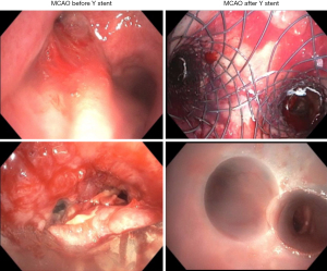 A common and challenging location for MCAO is the distal trachea—carinal region where the airway divides into the right and left mainstem bronchi. Tumors that metastasize to the subcarinal lymph nodes often break through the airway, leading to mixed obstruction and life-threatening narrowing or occlusion of two or even all three main airways. Often, these patients are the most impacted by the symptoms of central airway obstruction and are the most tenuous in their functional status. Despite the risk, successful recanalization can effectively palliate symptoms in such patients (14,15) and stents can help to make a sustained symptomatic benefit (14).