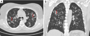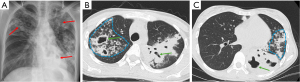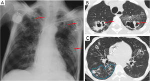 The differential diagnosis for cavities is extensive, encompassing infectious, malignant, and rheumatologic conditions (Table 1). Starting with findings from high-resolution computed tomography (CT) scans and combining them with the patient’s clinical history, physical exam results, and laboratory data can potentially refine the differential diagnosis of cavitary lesions. A disease process lasting less than 12 weeks (acute or subacute) is typically associated with common bacterial infections and less common causes such as nocardial and fungal infections, leading to pulmonary abscesses, necrotizing pneumonias, or septic emboli. In contrast, a chronic process lasting 12 weeks or more points toward mycobacterial, fungal, viral, or parasitic infections, malignancies like primary lung cancer or metastases, or autoimmune conditions such as rheumatoid arthritis (RA) or granulomatosis with polyangiitis (GPA) (3). The number, location, and characteristics of cavity walls are significant features that help differentiate between various causes (2,4). A single cavitary lesion is often associated with primary lung cancer or pulmonary abscess, whereas multiple cavities are more typical of conditions like septic emboli, GPA, rheumatoid nodules, or metastases (2,4). Lesion location can also provide clues, with upper lobe involvement being common in lung cancer and reactivation tuberculosis (TB), while lower lobe cavities are more often linked to septic emboli or metastatic disease. Wall thickness and contour offer additional diagnostic insights (2,4). Malignant cavities typically present with irregular internal walls and focal indentations on the outer contour, whereas benign cavities tend to have smooth walls. Nin et al. reported that CT measurements of wall thickness can be particularly informative with walls thicker than 24 mm being highly specific (100%) for malignancy, whereas walls thinner than 7 mm are 97% specific for benign lesions (5). Supporting imaging features that suggest a benign cause include surrounding consolidations and centrilobular or tree-in-bud nodules (5).