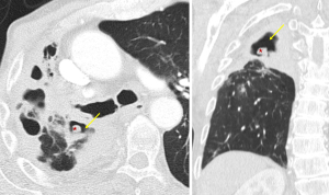 Aspergillomas, also known as fungus balls, form when Aspergillus grows within a preexisting cavity (7,19). The most common underlying diseases are TB and sarcoidosis (7,19). These cavities may be asymptomatic, though hemoptysis is the most common symptom (7,19). Typical imaging findings of aspergilloma include rounded and mobile gravity-dependent opacities within a preexisting cavity (7,19). The “crescent” sign, characterized by a crescent-shaped air collection around the fungus ball, is not specific to aspergilloma but can be seen (Figure 10) (7,19). Wall thickness is typically less than 3 mm, and local pleural thickening may be observed (7,19).