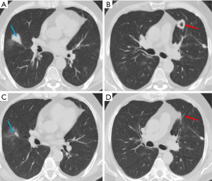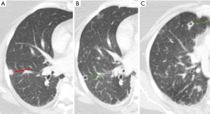 Among the key parameters to consider is the maximum wall thickness (2). The term “cavity” specifically refers to an air-filled lesion characterized by a relatively thick wall exceeding 4 mm or located within an area of surrounding infiltrate or mass (2,4,5). This distinction is important because the diagnostic approach and considerations for cavities and cysts differ, although there can be some overlap. Notably, cystic lung lesions are infrequently associated with malignancy, whereas cavitary lesions often raise strong suspicion of malignancy, especially in middle-aged or older adults with a history of smoking (2,4,5). Research by Woodring and colleagues, who reviewed chest radiographs of 65 cases of solitary lung cavities, showed that lesions with a maximum wall thickness of 4 mm or less are generally benign, while those with walls thicker than 15 mm are more likely to be malignant (6). A more recent study by Nin et al., involving CT analysis of 96 cases of solitary cavitary lesions, revealed that the maximum wall thickness is one of the most effective criteria for distinguishing between malignant and non-malignant causes of solitary pulmonary cavities, with the most reliable thresholds being 24 mm for malignancies and 7 mm for benign lesions (5). The study identified mycobacterial infections as the most frequent cause of non-malignant lesions, while primary lung carcinoma was the most common malignancy (5). Additionally, the presence of perilesional centrilobular nodules was associated with benignity, while malignant lesions often displayed perilesional consolidation (5).