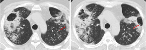 Infectious processes can complicate pre-existing cystic lung diseases, leading to increased wall thickness that resembles cavitary lung lesions, sometimes with a fluid level (Figure 16) (26). When prior imaging is unavailable, distinguishing between pre-existing cysts and newly developed lesions can be challenging (26).