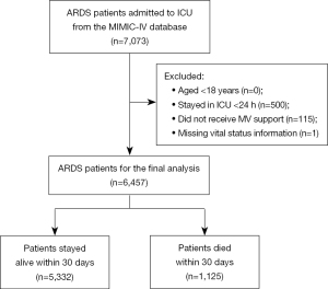 Excluded criteria were as follows: (I) patients admitted to ICU <24 hours; (II) patients without MV use; (III) missing the information of death time.