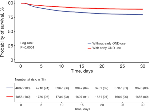 After PSM, patients who received early OND use had lower odds of 30-day mortality compared with those who did not (HR =0.77, 95% CI: 0.63–0.94). The low dose of early OND use was associated with a decreased risk of 30-day mortality (HR =0.67, 95% CI: 0.54–0.83) (Table 3).