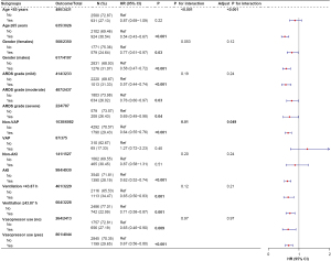 To further explore the associations, subgroup analyses were performed with results shown in Figure 3. Early OND use was related to lower odds of 30-day mortality of ARDS patients aged ≥65 years (HR =0.54, 95% CI: 0.43–0.67), with females (HR =0.77, 95% CI: 0.61–0.97) or males (HR =0.58, 95% CI: 0.47–0.72), with ARDS grades of mild (HR =0.57, 95% CI: 0.44–0.74), moderate (HR =0.76, 95% CI: 0.60–0.97) or severe (HR =0.69, 95% CI: 0.49–0.98), without VAP (HR =0.64, 95% CI: 0.55–0.76), with AKI (HR =0.62, 95% CI: 0.52–0.74), with short (<43.87 h, HR =0.65, 95% CI: 0.50–0.83) or long (≥43.87 h, HR =0.71, 95% CI: 0.58–0.87) ventilation time, and those who received vasopressor (HR =0.67, 95% CI: 0.56–0.80) or not (HR =0.65, 95% CI: 0.46–0.90). The age (Pinteraction<0.001) or VAP (Pinteraction=0.01) and early OND use had an interaction effect on 30-day mortality risk.