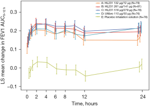 Overall, the improvement in lung function in patients with COPD was positively correlated with the dose of HL231, and the bronchodilatation effect for HL231 at a dose of 261 µg/141 µg group was most comparable to that of Ultibro®.