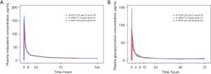 In Part B, for the dose of 261 µg/141 µg, Cmax of indacaterol was 170.73±79.57 pg/mL, which was approximately 86% of that of Ultibro®. The Median Tmax of indacaterol at a dose of 261 µg/141 µg was 0.50 h, which was slightly longer than that of Ultibro® (0.37 h). However, AUC0-t of indacaterol was comparable to that of Ultibro® (1,614.50±704.87 vs. 1,665.13±237.64 h·pg/mL). t1/2 of indacaterol was also comparable to that of Ultibro® (59.90±20.92 vs. 61.57±10.73 h, Table 3). For the HL231 dose of 261 µg/120 µg, the PK profile of indacaterol was similar to the dose of 261 µg/141 µg.