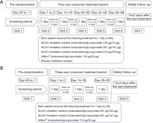 There were two parts in the present study (Figure 1). Part A employed a multicenter, randomized, single-dose, single-blind, crossover design. The target population size was 80. After a 28-day screening period, 84 eligible patients were included from seven medical centers (West China Hospital of Sichuan University, Shengjing Hospital Affiliated to China Medical University, the Third Xiangya Hospital of Central South University, Jiangxi Provincial People’s Hospital, Qianfoshan Hospital, Wuxi People’s Hospital, and Yibin Second People’s Hospital) across China by the investigators and randomly assigned to ten sequence groups. Each group was participating in five treatment visits separated by a washout period of at least 14 days between two visits. The randomization schedule was generated by the statistical team using the block randomization procedure (Proc Plan) in SAS software, version 9.4. The study employed a 5-factor Williams design to generate 10 different dosing sequences for drug administration. Patients were randomized to receive a single dose of HL231 (132 µg/72 µg, 261 µg/141 µg, or 516 µg/279 µg), Ultibro®, or placebo inhalation solution at each treatment visit. Blinding was implemented for the personnel conducting pulmonary function tests.