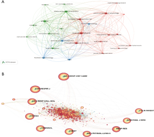 Data shown in Table 4 reveal the top 10 journals ranked by the number of publications and the most cited journals in the field. The data reveal a dual dynamic in scholarly communication, specialized respiratory journals dominate publication volume, while high-impact clinical journals drive citation networks. Respiratory Research leads with 115 publications, reflecting its niche focus on mechanistic studies, though its modest IF (IF =4.7) contrasts sharply with its most-cited journal, the American Journal of Respiratory and Critical Care Medicine (AJRCCM, IF =19.3). This asymmetry highlights how mid-tier journals serve as primary platforms for foundational research, while their outputs are often validated through citations in elite clinical journals. PloS One (rank 3, 86 papers) and Scientific Reports (rank 10, 45 papers) exemplify open-access megajournals’ growing role in disseminating methodological or negative-result studies, despite their lower IFs (2.9–3.8).