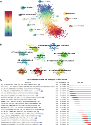 Table 5 displays the top 10 most frequently co-cited references. The list is anchored by three iterations of the Global Initiative for Chronic Obstructive Lung Disease (GOLD) guidelines (ranks 3, 4, 6, 10), collectively cited 238 times, reflecting their indispensable role in standardizing COPD diagnosis and management. These consensus documents, published in AJRCCM (IF =19.3), synthesize evolving insights into macrophage-driven inflammation and airway remodeling. Notably, Barnes PJ appears twice (ranks 1 and 5), cementing his status as a pioneer in COPD immunopathology. His 2016 review (Journal of Allergy and Clinical Immunology, 95 citations) remains the most cited work. Hogg JC’s 2004 NEJM article (rank 2, 90 citations) revolutionized COPD understanding by demonstrating small-airway obstruction as a macrophage-mediated process, bridging histopathology and functional decline. Similarly, Ito K’s 2005 NEJM study (rank 8, 44 citations) identified histone deacetylase (HDAC) suppression in COPD macrophages, a landmark in epigenetic research. Shaykhiev R’s 2009 work (rank 9, 43 citations) revealed smoking-induced AM polarization, a concept now central to therapeutic targeting of M1/M2 imbalances. The oldest article (Pauwels RA, 2001) and the newest (Vogelmeier CF, 2017) both focus on GOLD guidelines, emphasizing their iterative refinement. However, 70% of the list predates 2010, underscoring the enduring influence of early mechanistic work. Only Barnes’ 2016 review breaks this pattern, likely due to its synthesis of omics-era data.