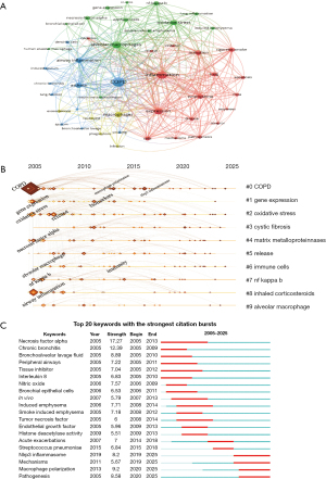 Figure 7A shows the keywords co-occurrence network visualized by the VOSviewer, each node in the diagram represents a keyword, and the connections between nodes indicate the relationship of keywords co-occurring in the literature. Nodes such as “COPD” and “inflammation” are relatively large and in a more core position, indicating that they are the core research topics in this field. The node of “alveolar macrophages” is also relatively large and is connected to “COPD” and “inflammation” through connections, indicating the key role of AMs in COPD and inflammation research. It is worth noting that although the node size of ‘epithelial cells’ in the keyword co-occurrence network is small, it has a significant correlation with ‘alveolar macrophages’, indicating that the interaction between the two has been partially studied. Figure 7B indicates the timeline analysis of keywords. #0 COPD: as the core cluster, its line runs through the entire time axis, and the starting node is relatively large, indicating that since 2000, the research on COPD itself has been in an important position and has continuously received attention. It is the basis and core content of research in this field. #1 gene expression: the cluster line also appears relatively early, and there are multiple nodes distributed in the time process, indicating that gene expression has been an important direction in COPD research since the early days. With the passage of time, there are continuous related studies, reflecting the enduring research enthusiasm for exploring the pathogenesis of COPD from the genetic level. #2 oxidative stress: the line has continuous distribution on the time axis, indicating that oxidative stress has always been a concerned field in COPD research, reflecting that researchers have long been concerned about the relationship between oxidative stress and the occurrence and development of COPD, and may be continuously exploring related therapeutic targets. #3 cystic fibrosis: compared with other clusters, this cluster line is relatively short and has fewer node distributions, indicating that although cystic fibrosis is related to COPD research, within the entire time span, its research heat and attention are relatively low, and it may be partially studied as a comparison or related field. #4 matrix metalloproteinases: judging from the appearance time and node distribution, matrix metalloproteinase-related research has received attention within a certain period of time. Especially, the nodes are more prominent in some years, indicating that the research on the role of such proteases in lung tissue changes in COPD research is a hot spot in a specific period. #5 release: the nodes on the line are relatively dispersed, indicating that research related to the release of various substances is a continuous but not a concentrated popular direction in the field of COPD. The research content may be relatively extensive and dispersed. #6 immune cells: the line runs through the time axis and has multiple nodes, indicating that immune cells have been continuously concerned in the research of COPD, reflecting the importance of immune mechanisms in the pathogenesis and treatment research of COPD. Relevant research continues to deepen over time. #7 nf kappa b: there is a certain distribution on the time axis, indicating that the role of NF-κB in the research of COPD is also a research direction. Especially, the nodes are obvious in some years, indicating that the research on the role of this factor in inflammation and immune regulation of COPD is relatively concentrated in these periods. #8 inhaled corticosteroids: The clustering line reflects the situation of inhaled glucocorticoids in the treatment research of COPD. There are node distributions from the beginning to the subsequent time, indicating that the research on this type of drug has existed since the beginning, and its application and effect in treatment are continuously explored over time. #9 alveolar macrophage: the line and node distributions show that AMs are also an important content in the research of COPD. There are relevant studies from the early stage to the later stage, indicating that the research on the role of this key lung immune cell in COPD has been ongoing. Figure 7C shows the burst analysis of the top 20 keywords in the study. The burst strength of “necrosis factor alpha” reaches 17.27, which is the highest in the table. This indicates that during the period from 2005 to 2013, this keyword received extremely high attention in relevant research. This may be because important progress has been made in the research on TNF-α in aspects such as the inflammatory mechanism of COPD, or because it is a potential therapeutic target, which has triggered extensive discussions and citations by many scholars. The burst strength of “interleukin 8” is 6.83, and the emergence intensity of “nitric oxide” is 7.57. These keywords also received a considerable degree of attention during their respective emergence periods. They are usually closely related to the inflammatory response and pathophysiological process of COPD, reflecting the importance of these molecules in COPD research and becoming research hotspots in specific periods. Keywords with relatively low burst strength: For example, the emergence intensity of “mechanisms” is 5.67. Although the value is relatively not high, due to its broadness, it has maintained a certain degree of emergence heat from 2011 to 2025, indicating that the research on various mechanisms of COPD is a long-term continuous process that runs through a long research history. Keywords with short-term emergence: “chronic bronchitis” emerged from 2005 to 2009 for 4 years; “bronchoalveolar lavage fluid” emerged from 2005 to 2010 for 5 years. These keywords have a relatively short emergence time. It may be that in a specific period, there are new discoveries or research progress in aspects 