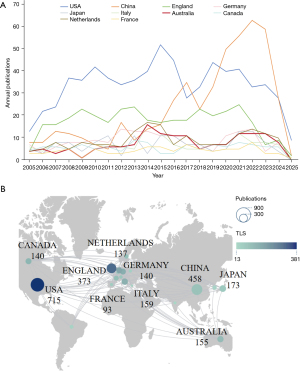 Table 1 presents the top 10 countries/regions in terms of publication volume, The USA dominates with 715 publications, nearly double that of China (n=458) and significantly surpassing England (n=373). While the USA leads in total output, its average citation count (60.69 per paper) is surpassed by Canada (75.81), England (68.81), and France (63.52), suggesting nuanced variations in research impact. The H-index, a composite metric of productivity and influence, further underscores the USA supremacy (H-index =102), followed distantly by England (H-index =81), while China (H-index =47) and Germany (H-index =47) lag despite moderate publication volumes. Centrality values, reflecting a country’s role as a collaborative hub, reveal England (0.30) and the USA (0.29) as central nodes, whereas China (0.04) and Japan (0.02) exhibit limited integration into global networks. TLS, quantifying international collaboration intensity, peaks for the USA (TLS =381) due to sheer scale, but the Netherlands (TLS =178) demonstrates exceptional collaborative efficiency relative to its modest output (n=140). China’s position as the second-largest contributor by volume contrasts sharply with its low average citations (19 citations), H-index (H-index =47), and centrality (centrality =0.04), indicating a systemic gap between quantity and quality. This discrepancy may stem from limited international partnerships (TLS =87, the second-lowest among the top 10 nations) or nascent research maturity in specialized subfields. Conversely, Canada’s high citation impact (75.81 citations) and England’s dual strength in centrality and citations suggest entrenched expertise and cross-border synergy. Germany (centrality =0.11, TLS =157) and the Netherlands (centrality =0.14, TLS =178) further exemplify how mid-sized research ecosystems achieve disproportionate influence through strategic collaboration. Japan’s low centrality (centrality =0.02) and TLS (TLS =65) despite moderate output (n=173) signal isolation risks, while France’s high citations (63.52 citations) paired with minimal output (n=93) hint at niche specialization.