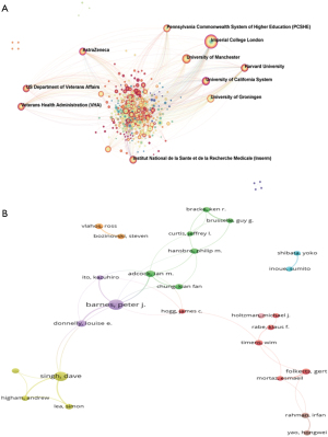 As shown in Table 2, the data delineate a hierarchical landscape dominated by Anglo-American institutions, with Imperial College London (England) emerging as the unequivocal leader (n=172), nearly triple the output of runner-up University of Manchester (n=69). Its dominance extends to citation impact (average 93.05 citations per paper) and scholarly influence (H-index =65). The USA institutions collectively claim five positions, though with fragmented productivity: Pennsylvania Commonwealth System of Higher Education (PCSHE) achieved the highest average citations (93.81), while US Department of Veterans Affairs and Veterans Health Administration (VHA) achieved moderate citation rates (44.98–45.66). European representation includes Inserm (France) and University of Groningen (Netherlands): Inserm’s high centrality (centrality =0.08) and citation efficiency (60.14 citations) suggest strategic alignment with EU-funded initiatives like the Innovative Medicines Initiative, whereas Groningen’s studies yield robust per-paper impact (67.13 citations). Notably, AstraZeneca (England) ranks 6, underscoring industry-academia synergy in drug discovery, though its lower centrality (centrality =0.10) hints at proprietary collaboration limits. Harvard University (USA) and University of California System exemplify bifurcated USA strategies: Harvard’s moderate output (n=51) but high citations (62.75 citations) align with precision medicine paradigms, while University of California System’s broader network engagement (centrality =0.08) supports multi-center trials on macrophage heterogeneity. Paradoxically, PCSHE (USA) achieves citation excellence (93.81 citations) despite mid-tier productivity (n=56), likely through high-impact journals (NEJM, Lancet Respiratory). Critical disparities emerge in institutional roles: Imperial College London’s centrality (centrality =0.16) cements its role as a global hub, whereas University of Manchester (centrality =0.03) and Groningen (centrality =0.02) remain peripheral despite moderate output.
