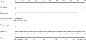 Tumor biomarkers, that are the biochemical indicators and reflect biological processes, can be utilized for the early diagnosis of diseases (18,19). Tumor biomarker screening offers distinct advantages including minimal invasiveness, high reproducibility, convenient sampling, and technical simplicity. The elevation of serum tumor markers may precede clinical symptom onset, which thereby enables a noninvasive early detection of tumor. Furthermore, longitudinal tumor marker variations facilitate histopathological subtyping, staging, and tumor burden quantification, thereby informing personalized treatment strategies (20). This study innovatively stratifies SPN patients into invasive (IAC) and preinvasive-minimally invasive (AAH/AIS/MIA) groups based on pathological diagnosis. A clinical predictive model, which innovatively integrated serum tumor markers with CT imaging features, was developed to noninvasively predict the invasiveness in solitary pulmonary adenocarcinoma before surgery, with the aim to assist in selecting segmentectomy or lobectomy treatments. We present this article in accordance with the TRIPOD reporting checklist (available at https://jtd.amegroups.com/article/view/10.21037/jtd-2025-950/rc).
