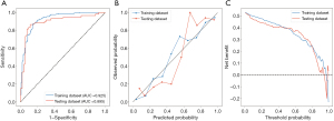 The univariate and multivariate analysis results for the training cohort are shown in Table 3. Univariate analysis revealed significant associations between age, tumor markers (CEA, CYFRA 21-1), and CT imaging features (maximum diameter, density type, shape, spiculation, pleural retraction, lobulation, and air bronchogram) and invasiveness (P<0.05 for all). Subsequent multivariate logistic regression analysis further identified four independent risk factors for differentiating Group A and Group B: CYFRA 21-1 [odds ratio (OR): 4.175; 95% CI:1.253–13.904; P=0.02], maximum diameter (OR; 1.247; 95% CI: 1.143–1.361; P<0.001), density type (OR: 6.604; 95% CI: 3.519–12.393; P<0.001), and air bronchogram (OR: 3.149;95% CI: 1.406–7.051; P=0.005). A logistic regression clinical prediction model was constructed using the training dataset and validated with the testing dataset. Figure 4 presents the nomogram for the training cohort. ROC curve analysis (Table 4, Figure 5A) demonstrated a robust and comparable diagnostic performance in the two datasets. The training dataset achieved an AUC of 0.925 (95% CI: 0.897–0.953), accuracy of 0.863, sensitivity of 0.872, specificity of 0.853, PPV of 0.872, NPV of 0.853 (P<0.001), while the external testing dataset yielded an AUC of 0.895 (95% CI: 0.829–0.961), accuracy of 0.876, sensitivity of 0.833, specificity of 0.925, PPV of 0.926, NPV of 0.831 (P<0.001). The calibration curve (Figure 5B) and Hosmer-Lemeshow test indicated a good model fit, with no significant deviation from the ideal calibration line (training dataset: χ2=10.357, P=0.241; testing dataset: χ2=10.793, P=0.214). DCA curve (Figure 5C) showed similar and favorable clinical benefits across both datasets. These results collectively validated that this combined model exhibited a strong diagnostic performance and robust generalizability.