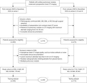 The inclusion criteria of this study were as follows: (I) pathologically confirmed AAH, AIS, MIA, or IAC through surgical resection; (II) availability of preoperative non-contrast chest CT scans within one month before surgery; (III) presence of SPN on CT imaging with maximum diameter ranging from 5 to 30 mm; (IV) complete clinical documentation. The exclusion criteria were as follows: (I) suboptimal chest CT image quality, such as motion artifacts or noise; (II) incomplete clinical documentation; (III) lesion diameter less than 5 mm on CT imaging; (IV) nodules radiographically indistinguishable from pleural lesions; (V) multiple pulmonary nodules.