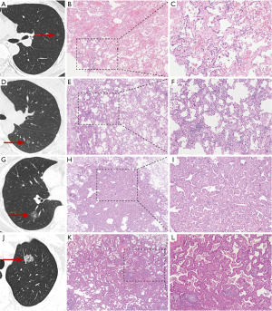 Lung cancer remains the leading cause of cancer-related mortality worldwide (1). Approximately 80% to 85% of lung cancers are non-small cell lung cancer, of which its histological subtypes include adenocarcinoma, squamous cell carcinoma, large cell carcinoma, and others. Among these, adenocarcinoma represents the most prevalent histopathological type, accounting for approximately 40% of all lung cancers (2,3). Pulmonary adenocarcinoma-related lesions encompass precursor glandular lesions and adenocarcinoma. The former includes atypical adenomatous hyperplasia (AAH) and adenocarcinoma in situ (AIS), while the latter comprises minimally invasive adenocarcinoma (MIA) and invasive adenocarcinoma (IAC) (4). In the multi-step progression model of adenocarcinoma, the disease progresses sequentially from AAH, AIS, MIA to IAC (4,5). AAH, AIS, and MIA always present with indolent growth patterns and a favorable prognosis, with 5-year survival rates approaching 100%, whereas IAC is associated with a significantly poorer prognosis (40–80%) (6,7).