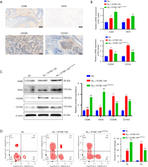 Considering the close relationship between cancer progression and TAM polarization, we strived to inquire the impacts of SYVN1 in regulating macrophage polarization. IHC staining manifested the high expression of CD206 and CD163 and the low levels of iNOS and CD86 in ESCC tissues, which indicated that the positive association of M2 phenotype polarization with SYVN1 expression (Figure 4A). Accordingly, M0 cells were obtained through exposing THP cells to PMA and then subjected to a co-culture of KYSE-150 cells with or without abundant expression of SYVN1. As anticipated, qPCR assay expounded that co-cultivation with SYVN1-expressing KYSE-150 cells facilitated a conspicuous augment in the expression of M2 markers CD206 and CD163, while silencing of SYVN1 in ESCC cells contributed to the inhibition of CD206 and CD163 levels (Figure 4B). Western blot further verified the promoting function of SYVN1 in M2 polarization of TAMs (Figure 4C). Consistently, results of flow cytometry assay illustrated that the proportion of M1 phenotype and the ratio of CD206+ macrophages were elevated when TAMs were co-cultivated with SYVN1-expressing KYSE-150 cells (Figure 4D). Notably, deficiency of SYVN1 triggered the increase of CD86+ macrophages and the diminished percent of M2 phenotype (Figure 4D). On the whole, our observations provided strong evidence that SYVN1 drove TAM polarization to M2 phenotype.