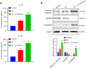 ELISA assay was carried out to explore the function of SYVN1 in inflammation. Compared with the control group, the concentrations of IL-18 and IL-1β were increased in KYSE-150 cells that co-cultured with M1 phenotype macrophages, and co-cultivation of SYVN1-downregulated KYSE-150 cells further caused the strengthened expression of IL-18 and IL-1β (Figure 5A). Whereupon, we speculated that SYVN1 might be participated in affecting cell pyroptosis. Through western blot analysis, we observed that the expression of N-GSDMD and cleaved-caspase 1 was markedly enhanced when M1 phenotype macrophages were co-cultured with KYSE-150 cells exhibiting SYVN1 deficiency (Figure 5B). Collectively, these results suggested that silencing SYVN1 induced M1 polarization of TAMs to accelerate ESCC cell pyroptosis.