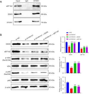 In consideration of that NF-κB signaling pathway plays a crucial role in ESCC (21), we planned to probe the effect of SYVN1 on NF-κB pathway. As DDX5 and eEF1A2 has been demonstrated to act as core modulators in NF-κB signaling (22,23), this study inquired the interplay of SYVN1 with DDX5 and eEF1A2. Co-IP experiment justified the enrichment of DDX5 and eEF1A2 in sediments by SYVN1 antibody, indicating that SYVN1 directly bound to DDX5 and eEF1A2 (Figure 6A). In addition, western blot showed that silencing of SYVN1 inhibited canonical NF-κB pathway activation, as evidenced by reduced phosphorylation of IκBα (Ser32/36) and p65 (Ser536), and decreased nuclear translocation of p65, while overexpression of DDX5 or eEF1A2 neutralized the role of SYVN1 knockdown in activation of NF-κB pathway (Figure 6B). Namely, Knocking down of SYVN1 impeded the activation of NF-κB pathway by weakening DDX5 and eEF1A2 expression.