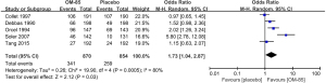 All included trials were evaluated to determine the proportion of patients who remained free from acute exacerbations when treated with OM-85 compared with placebo. The rate of patients remaining free from acute exacerbations was 39.2% in the OM-85 group and 30.3% in the placebo group. The pooled estimates revealed a significant improvement in the rate of patients remaining free from acute exacerbations in the OM-85 group compared with the placebo group (OR, 1.73; 95% CI: 1.04 to 2.87; P=0.03; Figure 2). Because substantial between-study heterogeneity was observed (I2=80%), the random effects model was used for our meta-analysis.
