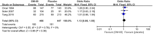 A total of 3 trials assessed the adverse events of OM-85 therapy (12-14). The pooled estimates using a fixed effects model demonstrated that the rate of any adverse events at the end point of the study did not differ significantly between the two groups (38.6% in the OM-85 and 36.0% in the placebo group; OR, 1.13; 95% CI: 0.86 to 1.50; P=0.38; I2=0%; Figure 4).