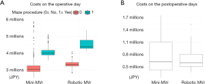 The costs of the operative day were significantly higher in the robotic-assisted MVr group than in the Mini-MVr group (P<0.001), with or without Maze procedure. In contrast, there was no significant difference in the postoperative costs between the groups (P=0.54) (Figure 2, Table 2).