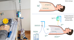 In response to the above-mentioned problems, this study proposed a modified drainage system that synergistically regulates based on the U-shaped water-surface balance principle and the siphon effect, which we name the U-shaped threshold-balanced extensive pleural lavage drainage system (UTB-EPLDS). Its core innovations are as follows: the thoracic drainage tube is extended and suspended into a U-shape, making the vertex of the U-shape level with the anatomical position of the top of the pleural cavity in the current body position. The principle of the communicating vessel is used to achieve automatic liquid-level balance. When the irrigation fluid is injected into the pleural cavity and the liquid level exceeds the vertex of the U-shape, the liquid automatically flows out through the U-tube due to the gravity difference. The siphon effect maintains drainage. The U-tube is completely sealed. After the initial negative pressure suction is established, the siphon action is continuously generated by the weight of the liquid, avoiding drainage interruption caused by tortuous tubes in traditional methods. Top-irrigation and bottom-drainage + low-flow continuous irrigation: Continuous low-flow perfusion is carried out through a thin catheter (8 Fr) at the top of the pleural cavity. The liquid infiltrates the pleural cavity from top to bottom under the action of gravity. Combined with the delayed drainage of the U-shaped structure, the contact time between the irrigation fluid and necrotic tissue is significantly prolonged. This system achieves fully automated irrigation-drainage through the dual mechanisms of liquid-level threshold-triggered drainage (with the vertex of the U-shape as the threshold) and self-maintained siphon, ensuring three-dimensional coverage of the pleural cavity while reducing nursing operations. To verify its effectiveness, we collected the data of empyema patients treated in Xiamen University Affiliated Chenggong Hospital from January 2018 to December 2024 and compared the differences in purulent fluid drainage efficiency, infection control speed, and operation efficiency between the new U-shaped system and traditional regimens. We present this article in accordance with the STROBE reporting checklist (available at https://jtd.amegroups.com/article/view/10.21037/jtd-2025-923/rc).