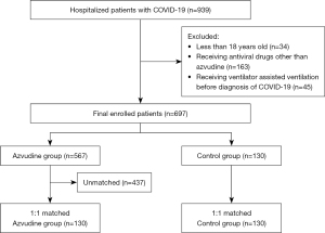 Hospitalized patients who met the following criteria were included in this study: (I) hospitalized patients with a positive result of SARS-CoV-2 through reverse transcription-polymerase chain reaction (RT-PCR) or a clinical diagnosis of COVID-19; (II) hospitalized COVID-19 patients who were treated with azvudine as an antiviral therapy or received only the standard of care (SOC) therapy. SOC therapy should follow the Diagnosis and Treatment Protocol for Novel Coronavirus Pneumonia (Trial Version 9).