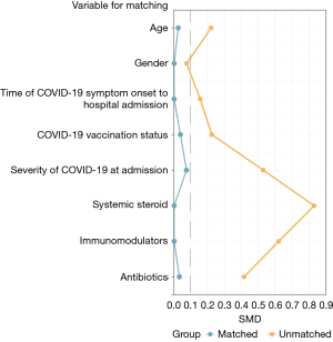 To determine the correlation between azvudine treatment and outcomes in hospitalized COVID-19 patients, we employed propensity score matching (PSM). We calculated the propensity scores for baseline covariates such as gender, age, time of COVID-19 symptoms onset to hospital admission, COVID-19 vaccination status, severity of COVID-19 at admission, and concomitant drug treatment status. Then, we performed 1:1 nearest-neighbor matching with a 0.25 caliper using propensity scores. The common support region of propensity scores and standardized mean differences (SMD) were used to assess covariate distribution similarity between azvudine and control groups in the matched samples. After PSM, the data balance is good, SMD value of baseline covariates were less than 0.1 and a high degree of overlap between the two groups according to the probability density distribution chart (Figure 2, Figure S1).