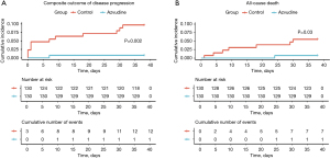 Cox regression analysis was utilized to examine the differences in clinical outcomes, including the composite outcome of disease progression, all-cause mortality, ICU admission, and receiving ventilator-assisted ventilation between the two groups. In a competing risk analysis, it showed that there is no significant impact of competitive risks between the death and ICU admission (P=0.055), death and receiving ventilator-assisted ventilation (P>0.99) on the core results. From Table 2, it can be observed that in the final analysis of 260 hospitalized patients with COVID-19, 13 patients had complex disease progression events during the 38-day observation period. One case in the azvudine group (0.77%), twelve cases in the control group (9.23%). There was a statistically significant difference in comparison between azvudine group and the control group (P=0.02). Azvudine was linked to a lower combined risk of disease progression (HR: 0.08, 95% CI: 0.01 to 0.62). It reduced the risk of composite outcome of disease progression (ARR: 0.08, 95% CI: 0.02 to 0.15; NNT: 12, 95% CI: 7 to 50). The treatment with azvudine notably reduced the cumulative incidence rates of composite outcome of disease progression, as shown in Figure 3A. There were 8 cases of all-cause death events, with one case in the azvudine group (0.77%) and seven cases in the control group (5.38%). Kaplan-Meier analysis showed that hospitalized COVID-19 patients treated with azvudine had a low all-cause death risk compared to control group (P=0.03, log-rank test) (Figure 3B). But after Cox regression adjusted for confounding factors, the difference wasn’t significant (P=0.07), with a hazard ratio of 0.14 (95% CI: 0.02 to 1.13) and ARR is 0.05 (95% CI: −0.01 to 0.10). A total of 8 cases required ICU admission, with one case in the azvudine group (0.77%) and seven cases in the control group (5.38%). There was also no statistically significant difference between the two groups (P=0.07) with a hazard ratio of 0.14 (95% CI: 0.02 to 1.13) and ARR is 0.05 (95% CI: −0.01 to 0.10). A total of 9 cases required ventilator-assisted ventilation, with one case in the azvudine group (incidence rate of 0.77%) and eight cases in the control group (incidence rate of 6.15%). There was a statistically significant difference between the two groups (P=0.047). Azvudine can reduce the risk of hospitalized COVID-19 patients’ ventilator-assisted ventilation needs, with a hazard ratio of 0.12 (95% CI: 0.02 to 0.97) and ARR is 0.05 (95% CI: −0.002 to 0.11). These results indicated that azvudine had therapeutic advantages for hospitalized COVID-19 patients, lowering the risk of experiencing composite disease progressions events and the need for receiving ventilator-assisted ventilation. Subgroup analyses of four outcomes, including composite outcome of disease progression, all-cause mortality, ICU admission, and receiving ventilator-assisted ventilation, showed generally robust results (Tables S2-S5). In vaccinated patients, statistically significant differences were found in outcomes of composite outcome of disease progression and ventilator-assisted ventilation needs. The azvudine group had a lower risk of disease progression (HR: 0.12, 95% CI: 0.01 to 0.94, P=0.044) and a similarly lower risk of needing ventilator-assisted ventilation (HR: 0.12, 95% CI: 0.01 to 0.94, P=0.044) compared to the control group.