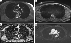 The chest MRI protocol implemented at our hospital is shown in Table 1. The diagnostic MRI criteria for thymic cysts are as follows (Figure 3):