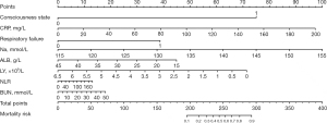 Firstly, we used multifactorial LASSO regression analysis for feature selection. This method can automatically select the most predictive variables, effectively avoiding overfitting issues that may arise in traditional regression analysis, thus ensuring the model’s stability and generalizability. Based on this, we constructed a nomogram prediction model, translating complex statistical results into an intuitive and understandable scoring system, allowing doctors to quickly quantify the patient’s risk of death in two months based on the scores of eight variables, which is assisting clinical decision-making.