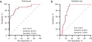 To comprehensively evaluate the model’s effectiveness and reliability, we conducted rigorous statistical validation. ROC curve analysis showed that the AUC of the nomogram model was 0.8774 in the modeling group and 0.8341 in the validation group. This result demonstrates the model’s excellent discriminatory ability, accurately distinguishing between high-risk and low-risk patients. Additionally, the AUC values approaching 0.9 indicate a high level of predictive accuracy, providing strong support for clinical decision-making.