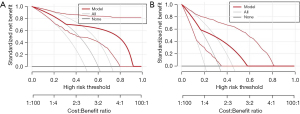 The results of the ROC curve analysis showed that the area under the curve (AUC) for the predictive value of the model in the modeling group was 0.8774, with a sensitivity of 88.24% and a specificity of 70.42% (Figure 5A). In the validation group, the AUC was 0.8341, with a sensitivity of 92.86% and a specificity of 72.88% (Figure 5B). These results suggest that the model has good predictive value for the prognosis of newly diagnosed patients with severe PTB in both the modeling and validation groups. The results of the DCA curve analysis indicated that the clinical benefit of the model in both the modeling and validation groups was superior to the “all” (assuming all patients die) or “none” (assuming no patients die) curves (Figure 6). The results of the calibration curve (Figure 7) suggested that the actual and corrected curves of the model fit well and were close to the ideal curve.