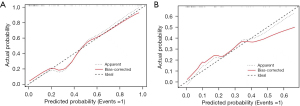 Furthermore, DCA curve analysis revealed the model’s practical value in clinical applications. Compared to the extreme assumptions of “all patients die” and “no patients die”, our prediction model showed higher clinical net benefit in both the modeling and validation groups. It should be noted that although the ideal effect range of the Model curve is relatively narrow, suggesting limited predictive efficacy in patients with extreme risk values. But this does not hinder the model’s outstanding predictive performance within the critical threshold range. Particularly in patients with moderate risk (high-risk threshold 0.2–0.6), its predictive capability remains reliable. These results confirm the scientific validity and effectiveness of our approach. Building on this foundation, we will focus on further optimizing the model and exploring additional potential predictive variables to broaden its application scenarios and enhance its predictive accuracy and generalizability. Additionally, calibration curve results further validated the model’s calibration performance. The close fit between the actual and corrected curves and their proximity to the ideal curve indicate a good consistency between the predicted probabilities and the observed outcomes. This finding not only enhances our confidence in the model’s predictive results but also lays a solid foundation for its widespread application in clinical practice.