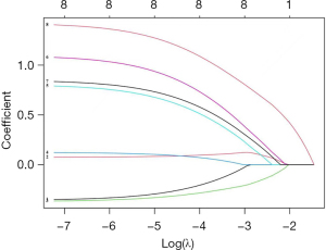 After identifying statistically significant indicators through univariate analysis, multivariate analysis was conducted. LASSO regression was used as the primary analytical tool due to its advantages in effectively handling high-dimensional data, preventing overfitting, and automatically selecting the most influential features for the predictive variables. The indicators with statistical significance from the univariate analysis were subjected to LASSO regression, using ten-fold cross-validation to select the optimal tuning parameter λ, which was λ=0.0142346121972067. At this point, the model’s mean squared error was minimized, ensuring high predictive accuracy and stability. The results indicated that eight variables, all with non-zero coefficients, were included. The identified prognostic factors influencing mortality in patients with newly diagnosed severe PTB were LY, NLR, ALB, BUN, Na, CRP, respiratory failure, and consciousness disorder. The corresponding non-zero coefficients were −0.23526199, 0.09096384, −0.29879209, 0.08217159, 0.56438757, 0.79732634, 0.62780684, and 1.14600626, respectively (see Figures 2,3).
