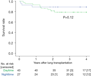Post-transplant pneumonia developed in 10% of recipients, with similar distribution between the groups: 12% in the daytime cohort and 7% in the nighttime cohort (P=0.57). Severe postoperative complications requiring surgical intervention (Clavien-Dindo grade III–V) were reported in 40% of patients overall, affecting 37% of patients in the daytime group and 44% in the nighttime group (P=0.31) (Tables S1,S2). In-hospital mortality was low, with three deaths recorded in the entire cohort—two patients (5%) in the daytime group and one (4%) in the nighttime group. Post-transplant care duration was similar between groups, with a median ICU stay of 9 days (IQR, 7–12 days) for daytime procedures and 8 days (IQR, 7–13 days) for nighttime procedures (P=0.61). Similarly, the total length of hospitalization showed no significant difference, with a median stay of 40 days for the overall cohort (P=0.76). The median follow-up duration was 3.9 years. Overall survival rates at 1 and 3 years were 91% and 79.5%, respectively. No statistically significant differences in survival were observed between groups (1-year: 93% vs. 89%, P=0.62; 3-year: 79% vs. 89%, P=0.12) (Figure 3). Pulmonary function recovery—defined as achieving a FEV1 greater than 80% of predicted within 1 year—was observed in 44% of the study population. Although the daytime group demonstrated a slightly higher rate of recovery (47%) compared to the nighttime group (41%), this difference was not statistically significant (P=0.32) (Tables S3,S4).