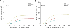 The overall incidence of tracheostomy was 32%. In the unmatched analysis tracheostomies were performed on 24% in Argentina {median 20 [16–24] days}, 40% in Spain {median 16 [12–21] days}, and 18% in the Netherlands {median 21 [17–27] days} (Figure 2). In matched analysis, differences in incidence and timing among nations did not change (Figure 2).