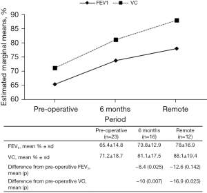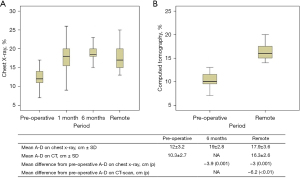The secondary endpoints were the evaluation of the benefit of surgery on VC and the effect of surgery on A-D measurements on chest X-ray and on CT, and its correlation with improvement of dyspnea and spirometry.