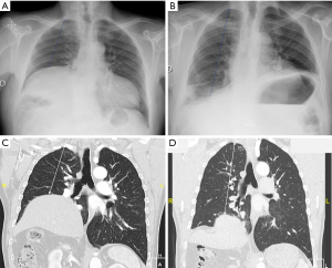 The following parameters were collected from the medical records at diagnosis: age, sex, body mass index (BMI), American Society of Anesthesiologists (ASA) physical status score, medical history: arrhythmia, coronaropathy, chronic obstructive pulmonary disease (COPD), pulmonary embolism, previous thoracic or cardiac surgery, smoking behavior, symptoms related to UDP. Evaluation of MRC was performed by the practician during the pre-operative consultation, according to the level of exercise possible for patients (from strenuous exercise to dressing). All radiologic exams were reviewed by an expert thoracic radiologist. Distance from apex (the upper edge of the first rib) to the top of the diaphragmatic dome [distance from apex to diaphragm (A-D)] was measured on chest X-ray in inspiration and on CT (in a coronal view at the carina level, 5 mm thickness in parenchymal window) (Figure 1). These static measurements were recorded pre-operatively. From pulmonary spirometry, we recorded pre-operatively, in sitting position: forced expiratory volume in one second (FEV1), VC, total pulmonary capacity (TPC) and residual volume (RV) and in supine position only VC. During hospitalization, the following parameters were collected: surgical technique, length of surgery, per-operative complication(s), time to chest tube ablation, length of hospital stay, incidence of complications before hospital discharge or in the 90 days after surgery according to the Clavien-Dindo classification. During follow-up, we recorded: clinical evaluation of dyspnea according to MRC dyspnea scale spirometry data, measurements on chest X-ray and measurements on CT. Patients lost to follow-up after their first post-operative consultation were contacted telephonically and invited to come for a consultation at our institution, where dyspnea score and clinical evaluation were done. Chest X-ray, CT and spirometry were performed during this consultation. Median time of follow-up was 19 months.