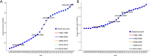 The JPR model, initially developed by Kim et al., is designed to conduct segmented regression based on disease distribution over time (13). This model divides the study period into distinct intervals through connection points, allowing for a detailed examination of temporal trends in disease incidence and mortality. Its core strength lies in its ability to detect statistically significant inflection points—time periods where the trend in prevalence or mortality rate changes direction or magnitude. This is particularly valuable in public health research, as it can highlight the potential impact of health policies, clinical guidelines, environmental exposures, or technological advancements (11). Model measurements are expressed as annual percentage change (APC) and average annual percentage change (AAPC). APC assesses the trend within independent intervals, while AAPC estimates the average trend across the entire study period. The log linear model equation is: , y is the prevalence or mortality, x is the year, β1 is the regression coefficient, k is the number of connection points, τk is the unknown connection point, a+=a when a>0, and 0 otherwise. The APC is calculated as , and the AAPC is calculated as follows: . A downward trend is indicated by APC <0, while an upward trend is indicated by APC >0. If APC equals AAPC, the trend is considered consistent without turning points.