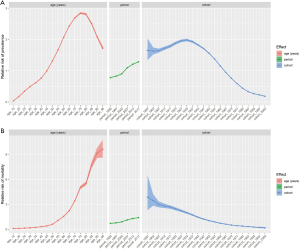 - Havulinna AS. Bayesian age-period-cohort models with versatile interactions and long-term predictions: mortality and population in Finland 1878-2050. Stat Med 2014;33:845-56. [Crossref] [PubMed]
