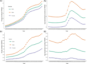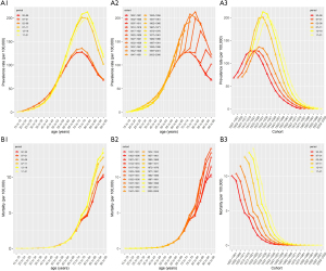 The BAPC model provides a refined analytical approach by employing integrated nested Laplace approximations, which improve upon traditional APC models in terms of coverage and accuracy. It is particularly advantageous for projecting age-standardized rates while accounting for uncertainty in parameter estimation. This Bayesian approach smooths the prior effects of age, period, and cohort through second-order random walks, assuming that adjacent periods exhibit similar impacts. Instead of relying on Markov chain Monte Carlo sampling, the BAPC model approximates the marginal posterior distribution with integrated nested Laplace approximation, alleviating issues related to mixing and convergence (8).