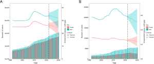 Before 2021, the age-standardized prevalence curves for ILD and PS indicate a steady upward trend and age-standardized mortality curve fluctuates, as seen in Figure 5. Between 2021 and 2030, the BAPC model forecasts the age-standardized prevalence trend to continue steadily, while the age-standardized mortality curve will display a steady decline. These trends are expected to be consistent for both males and females. By 2030, the model predicts an age-standardized prevalence of 31.78 cases per 100,000 for men and 24.26 cases per 100,000 for women. The predicted ASMRs for men and women are 0.51 and 0.25 cases per 100,000, respectively. Additionally, the forecast also indicates a continued increase in the absolute number of prevalent cases and deaths from 2021 to 2030, with males accounting for a larger share of both cases and fatalities.