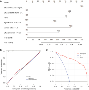 Many tumor markers in serum and PE have been used to identify MPE (9,10). Carcinoembryonic antigen (CEA) has been reported to be the best parameter either as an absolute value in pleural fluid or as a ratio (11). A single tumor biomarker is considered insufficient in diagnostic accuracy due to their low sensitivity (approximately 0.5), while the combination of tumor markers has been shown to improve diagnostic performance (12-14). Additionally, previous studies have reported that some laboratory parameters and ratios, including adenosine deaminase (ADA), lactate dehydrogenase (LDH), cancer ratio (CR), and CR plus, can effectively identify MPE (14,15). Our objective is to systematically evaluate and screen diagnostic variables, including clinical characteristics, laboratory parameters, and tumor biomarkers, and develop a cost-effective predictive model to differentiate MPE from BPE. The predictive model is visualized as a nomogram and further adapted into a scoring system to enhance clinical utility. We present this article in accordance with the TRIPOD reporting checklist (available at https://jtd.amegroups.com/article/view/10.21037/jtd-2025-826/rc).
