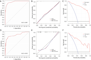 In the internal validation set, this scoring system exhibited favorable discriminative ability (AUC =0.872; 95% CI: 0.803–0.942; Figure 5D). At the optimal cutoff value of 28, the model demonstrated 80.0% sensitivity, 87.5% specificity, 83.3% PPV, 84.8% NPV, and likelihood ratios of 6.40 (PLR)/0.23 (NLR). The calibration curve (Figure 5E) validated model reliability (Hosmer-Lemeshow test, P=0.39), while DCA confirmed clinical utility across thresholds >20% probability (Figure 5F).