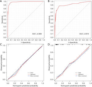 The scoring system effectively discriminated lung cancer-associated MPE from BPE, achieving AUCs of 0.984 (95% CI: 0.971–0.998) and 0.914 (95% CI: 0.845–0.984) in training and validation sets, respectively (Figure 6A,6B). The calibration curves are shown in Figure 6C,6D. At the optimal cutoff value of 28, the training set demonstrated a sensitivity of 98.8%, specificity of 85.3%, PPV of 78.2%, NPV of 99.2%, PLR of 6.73, NLR of 0.02, and an accuracy of 90.0%. In the validation cohort, the corresponding metrics were 88.2%, 87.5%, 78.9%, 93.3%, 7.06, 0.13, and 87.8%.